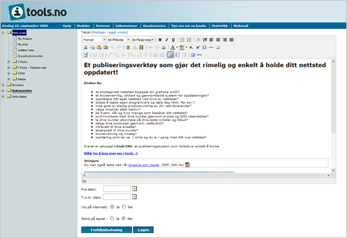 Våre kunder bruker ikke unødvendig med penger på kostbar utvikling. De høster fruktene av et ferdig system som inneholder alt man behøver for å holde et nettsted oppdatert.